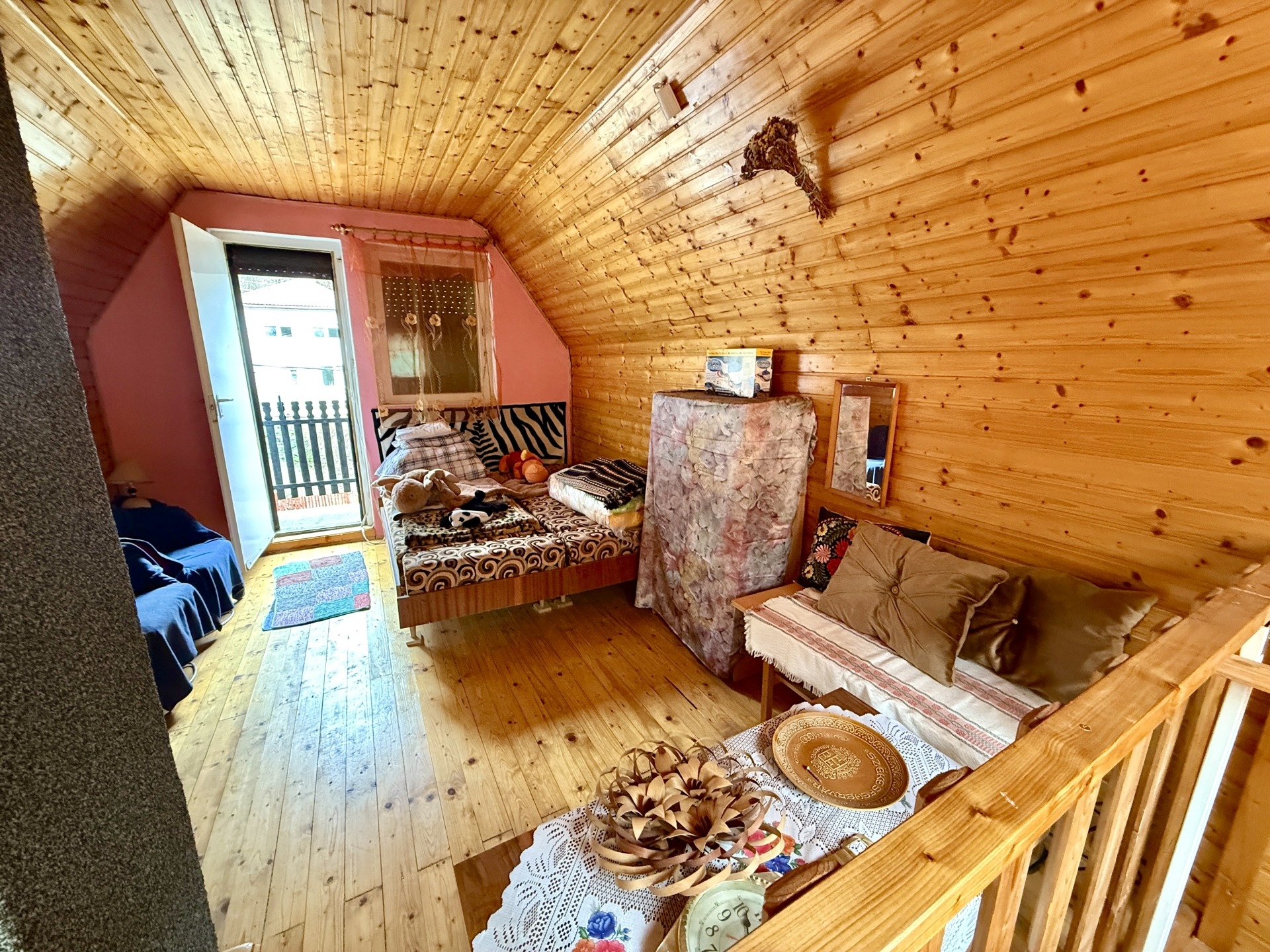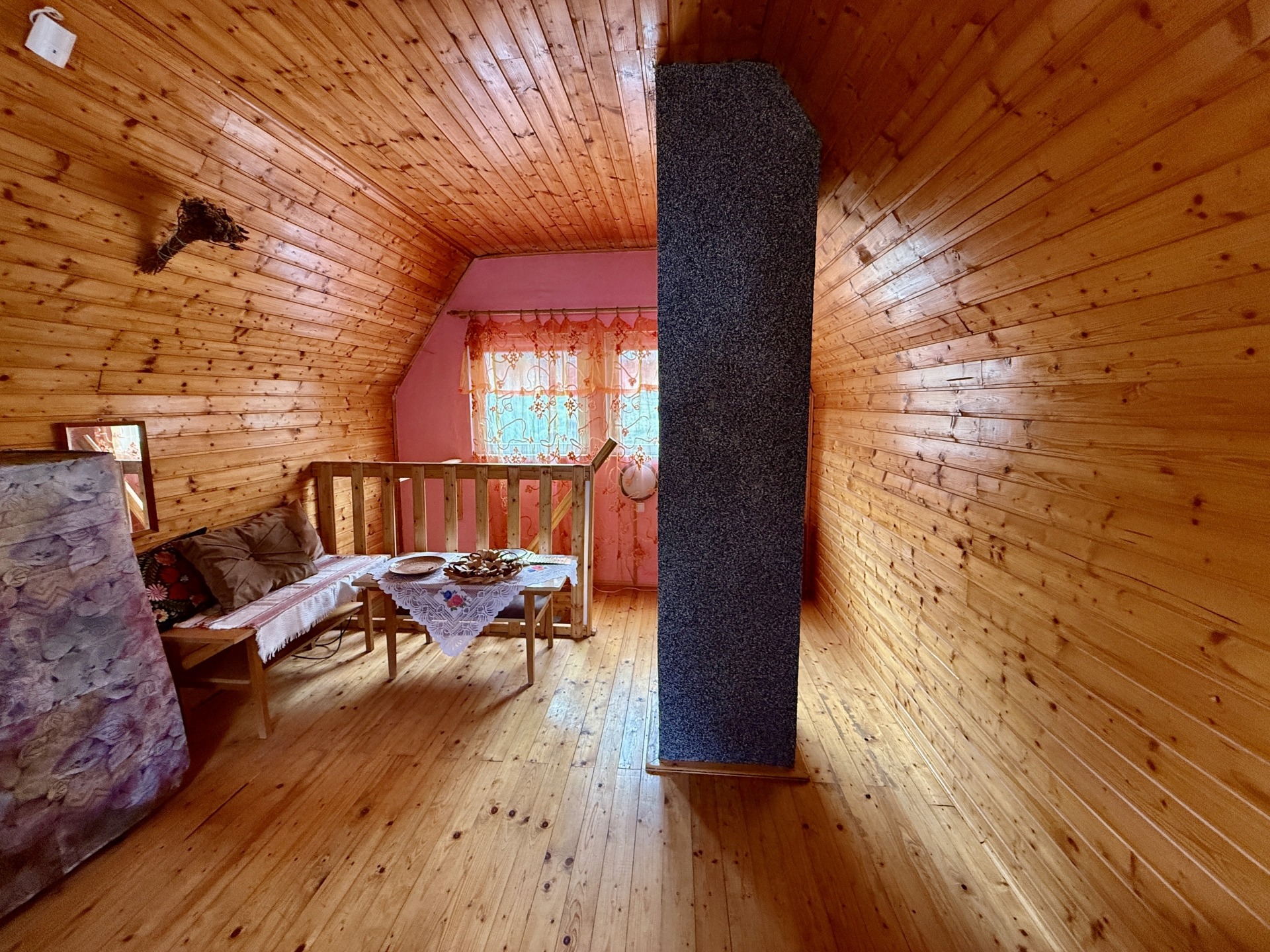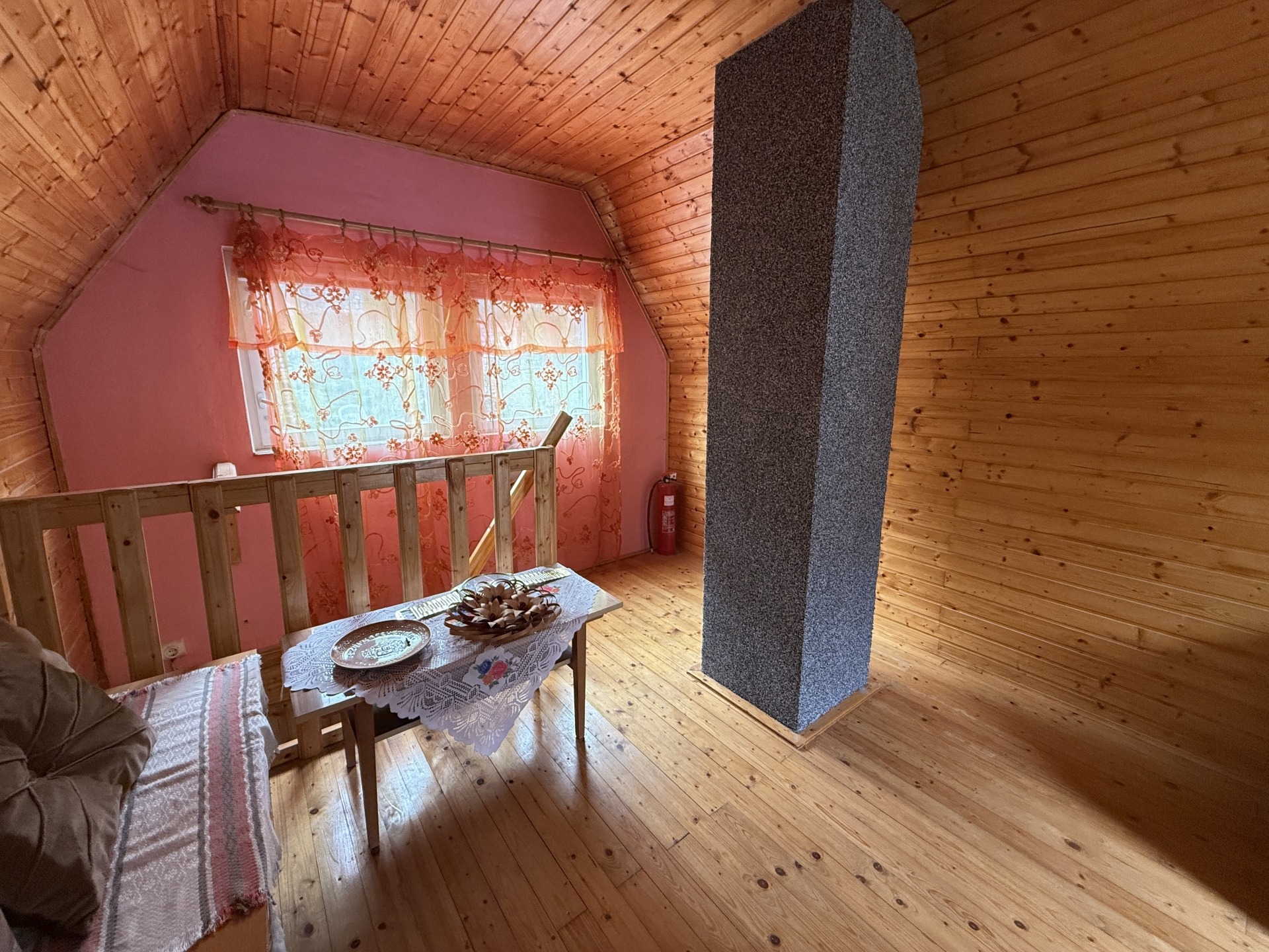 Az épület további részén található egy nagyobb nappali- konyha-étkező, egy fürdő és a tetőtérben egy tágas szoba kapott helyet. Két terasza van, mindkettőről szép panoráma nyílik az erdőre.