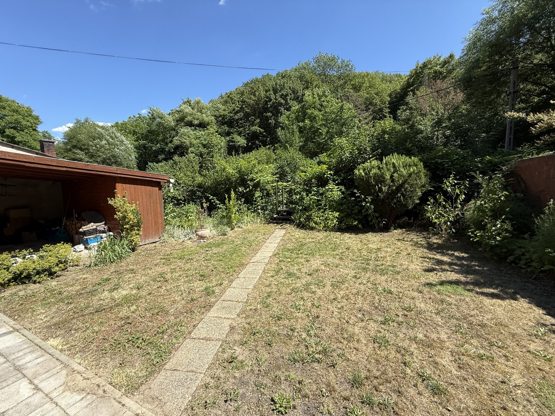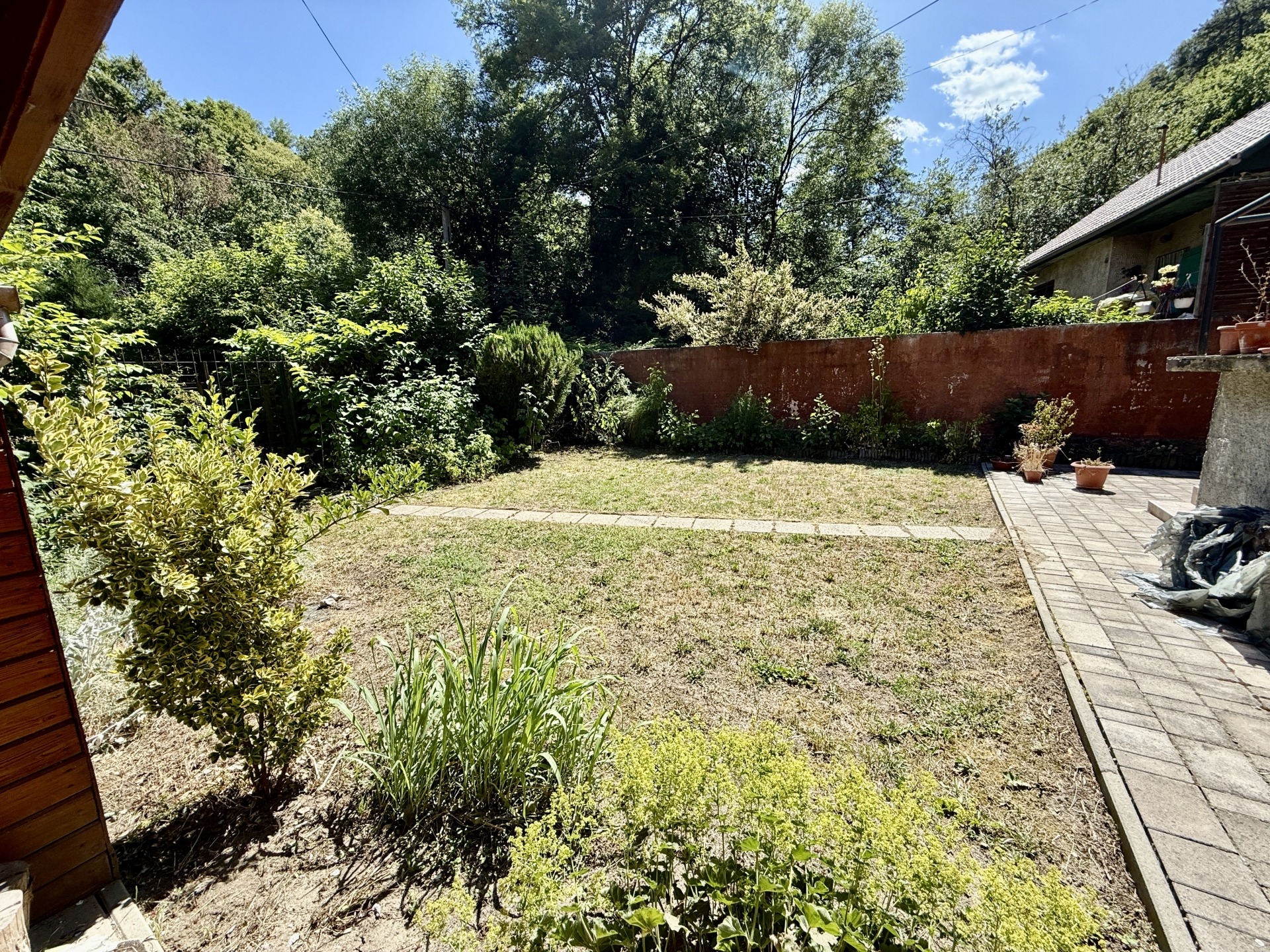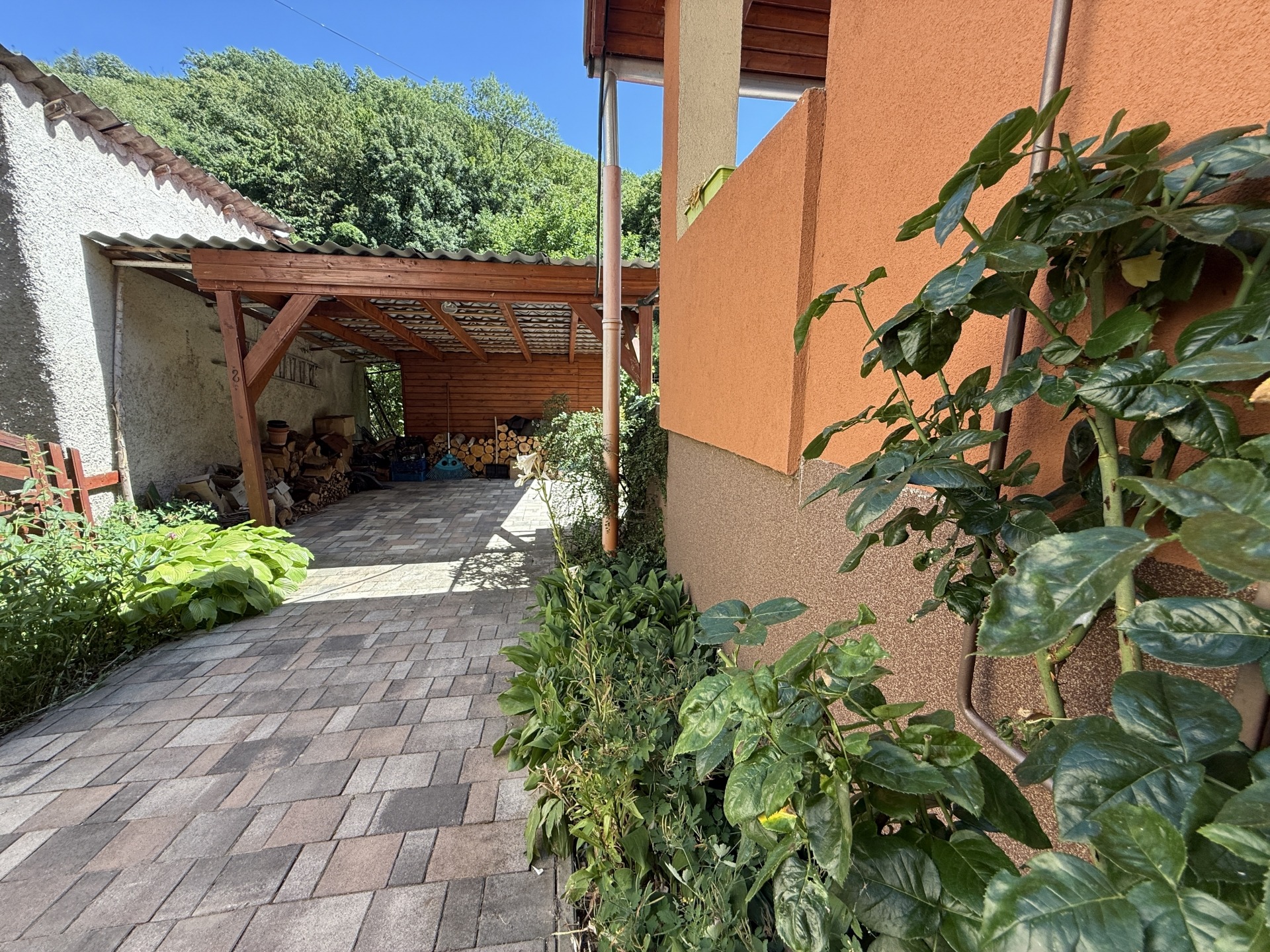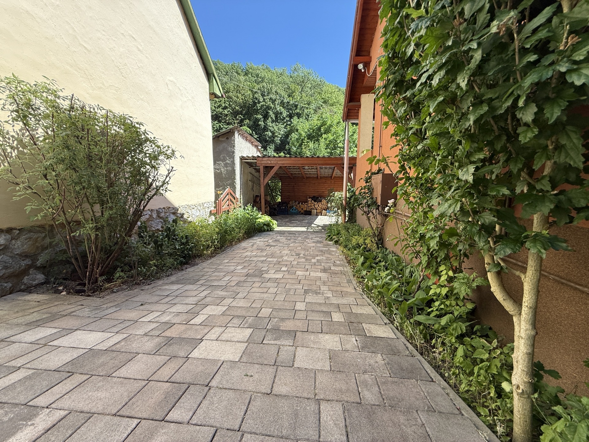 A telek rendezett, szépen térkövezett és füvesített része is van.